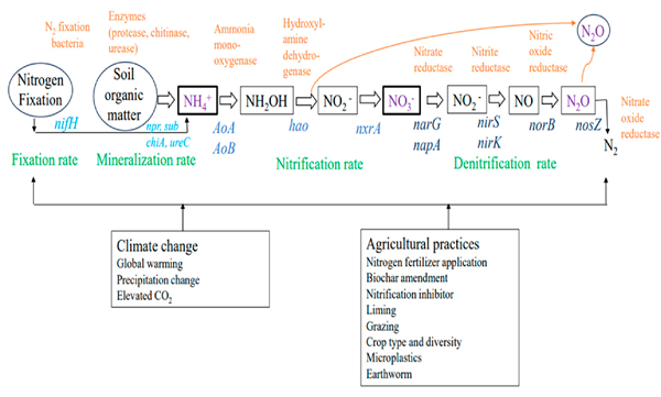The acceleration of the global nitrogen cycle and increase of nitrogen oxide emissions of N2O (nitrous oxide) and NO (nitrogen oxide) from fertilized soil, contributes to global warming, ozone depletion, and groundwater contamination. The “hole in the pipe” model was conceptualized by Firestone and Davidson (6), it explains the flow of Nitrogen and N2O emission increased with synthetic fertilizer application rate. High temperature, low soil water, soil compaction, poor drainage and low oxygen levels all resulted in high N2O emission. Furthermore, N2O